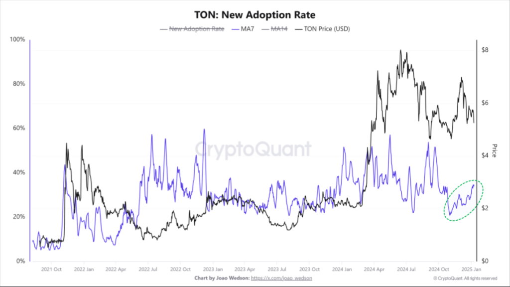 Un anรกlisis reciente de CryptoQuant muestra que la tasa de adopciรณn de TON ha vuelto a crecer, como se observa en el siguiente grรกfico.