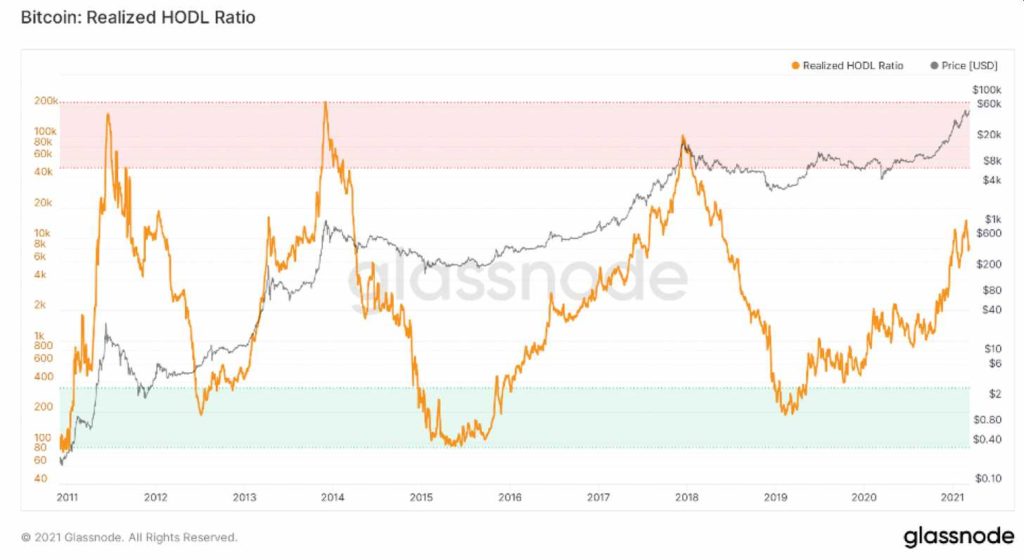 Este indicador llega a valores máximos cuando ocurren los topes de los ciclos alcistas, afirma Glassnode.