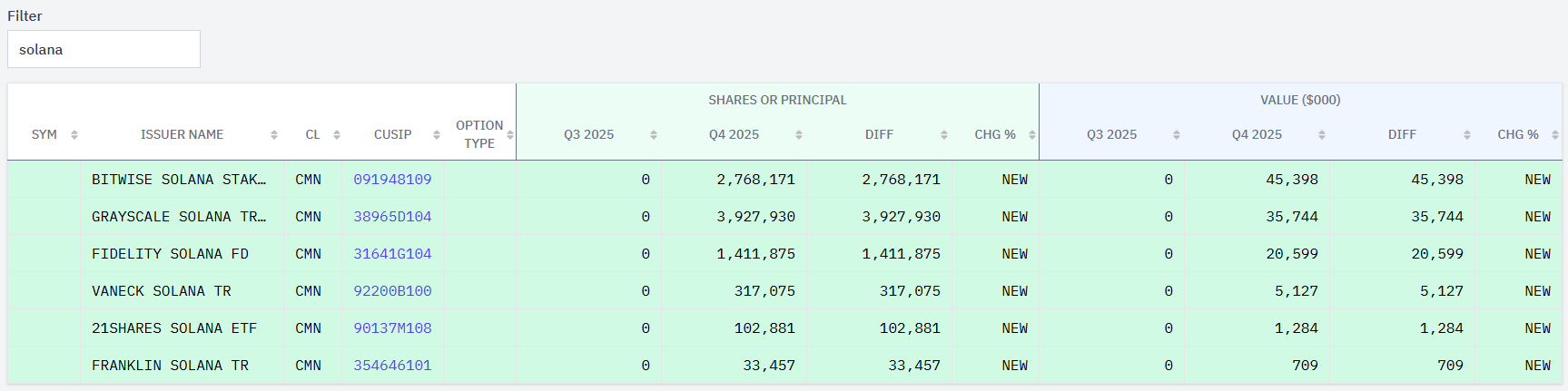Mientras tanto, empezรณ a invertir en cuatro ETF de XRP y seis de solana (SOL). En conjunto, su valoraciรณn al final del trimestre fue de USD 149 millones para sus instrumentos en la criptomoneda de Ripple y USD 108 millones para los de solana.