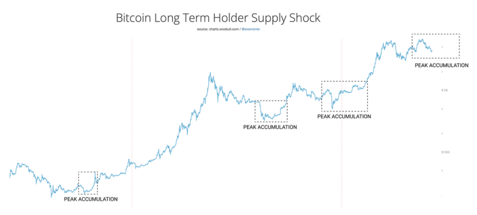 El especialista acompaña su explicación con un gráfico en el que se observa que, actualmente, bitcoin se encuentra en un pico de acumulación (peak accumulation). En momentos así, los hodlers que cuentan con liquidez, compran más BTC con la expectativa de venderlos a un precio más elevado.