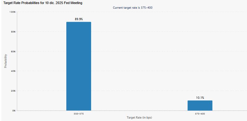 Datos del CME Group muestran que las probabilidades de un recorte de 25 puntos básicos alcanzan el 89,9%, mientras que solo el 10,8% del mercado prevé que la FED mantenga sin cambios el rango actual de 3,75%-4%.