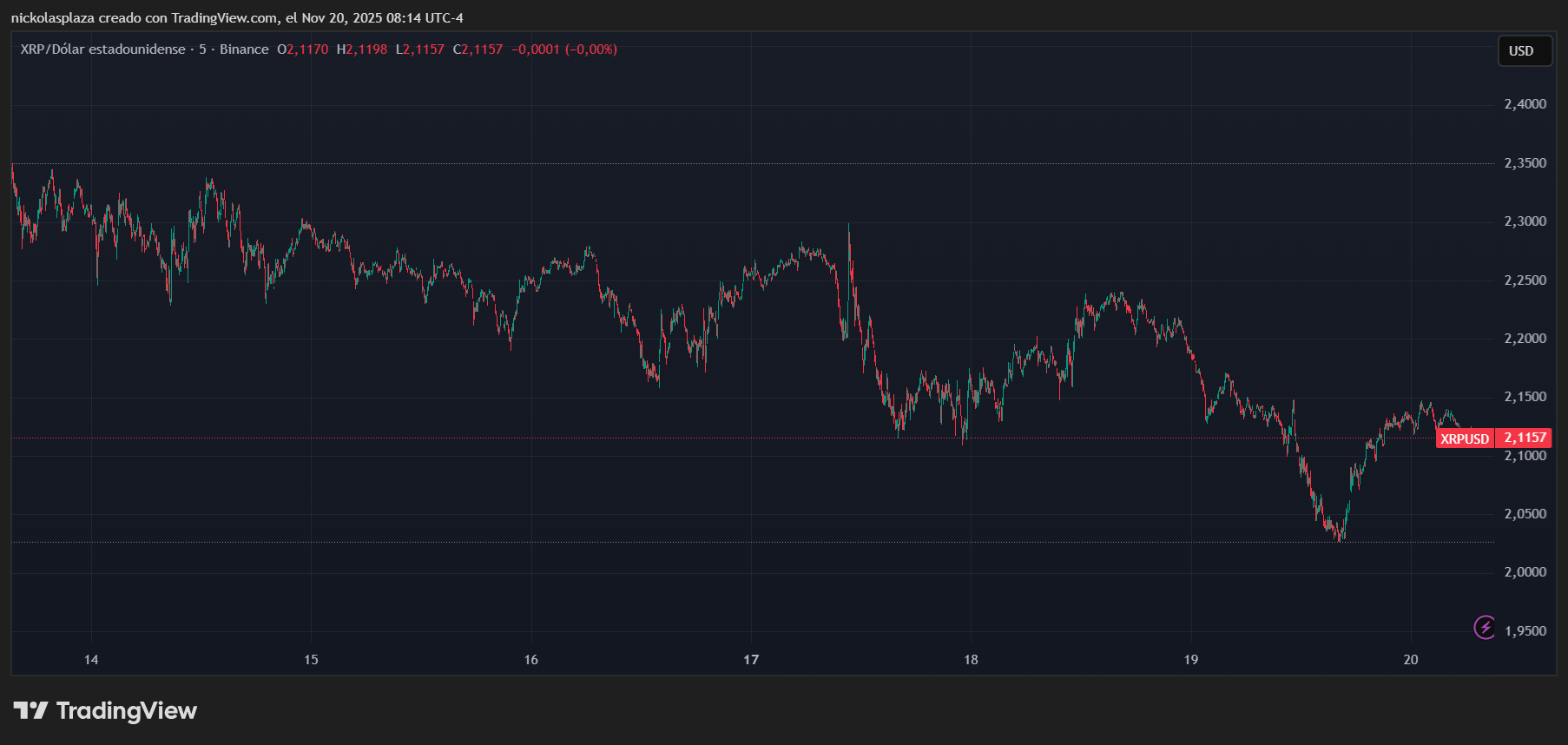 Pese a este importante debut en la bolsa, el precio de XRP se ha mantenido sin movimientos significativos, cotizando en torno a los 2,11 dรณlares. Este nivel de precios representa una distancia del 40% respecto a su mรกximo histรณrico (ATH) de 3,65 dรณlares. La consolidaciรณn por encima de este precio podrรญa ser clave para establecer un soporte mรกs firme y potencialmente impulsar un repunte en el corto plazo.