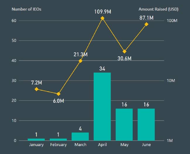 De acuerdo con el reporte de CoinGecko, los proyectos que han realizado mediante IEO en 2019, lograron recaudar más de USD 262 millones, un promedio de USD 3,7 millones por evento. En el mes de abril se realizaron 34 Ofertas Iniciales de Intercambio, con un total de USD 109 millones aportados por los inversionistas.