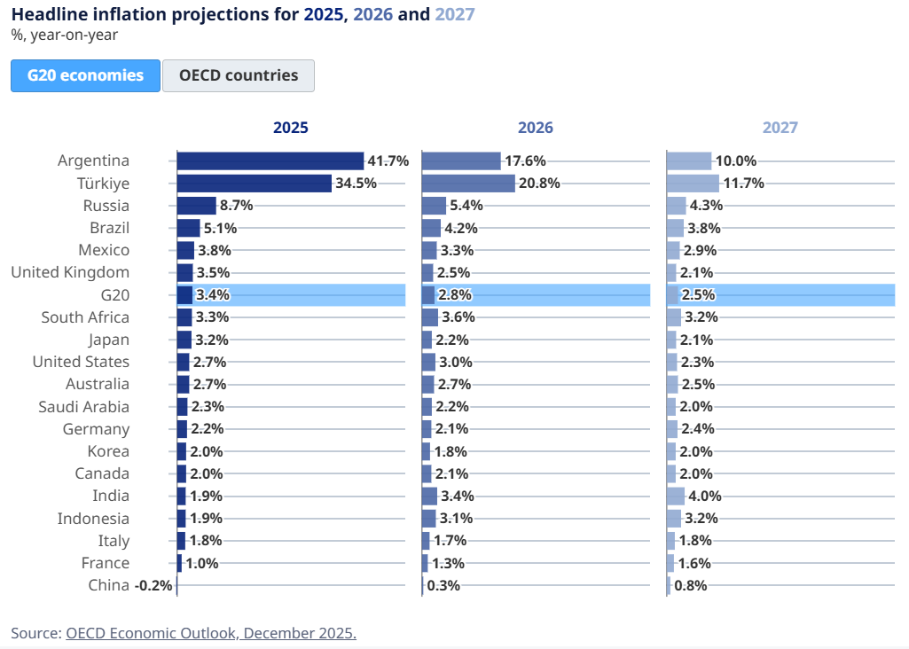 La Organización para la Cooperación y el Desarrollo Económicos (OCDE o, por su sigla en inglés, OECD) publicó el 1 de diciembre el segundo volumen anual sobre sus perspectivas. Este proyecta que la inflación bajará en los países que integran el G20 en 2026 y 2027, en gran parte por una reducción en Argentina.