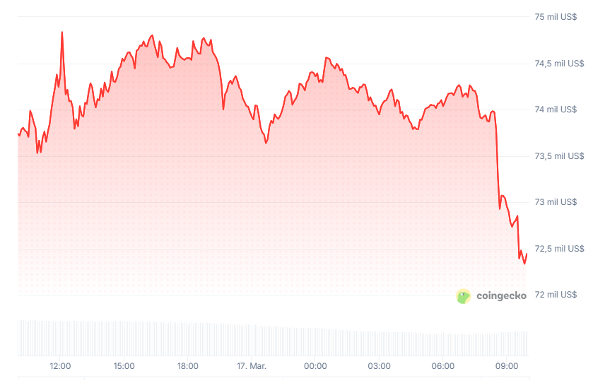 Bitcoin registra una caída del 1,8% en las últimas 24 horas. Al momento de esta publicación, la moneda digital cotiza a 72.286 dólares.