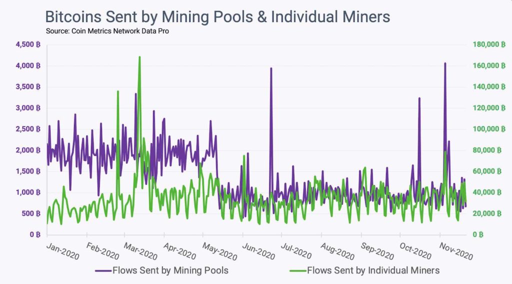 El estudio concluye que, si hubiese impedimento de venta por parte de los mineros individuales, los BTC retenidos deberían haber aumentado, y ese no es el caso, asevera Coin Metrics. Por otro lado, en el gráfico siguiente se contradice con más fuerza esa hipótesis. En el mismo, se representan los BTC enviados por pools (línea morada) y por los mineros individuales (línea verde).