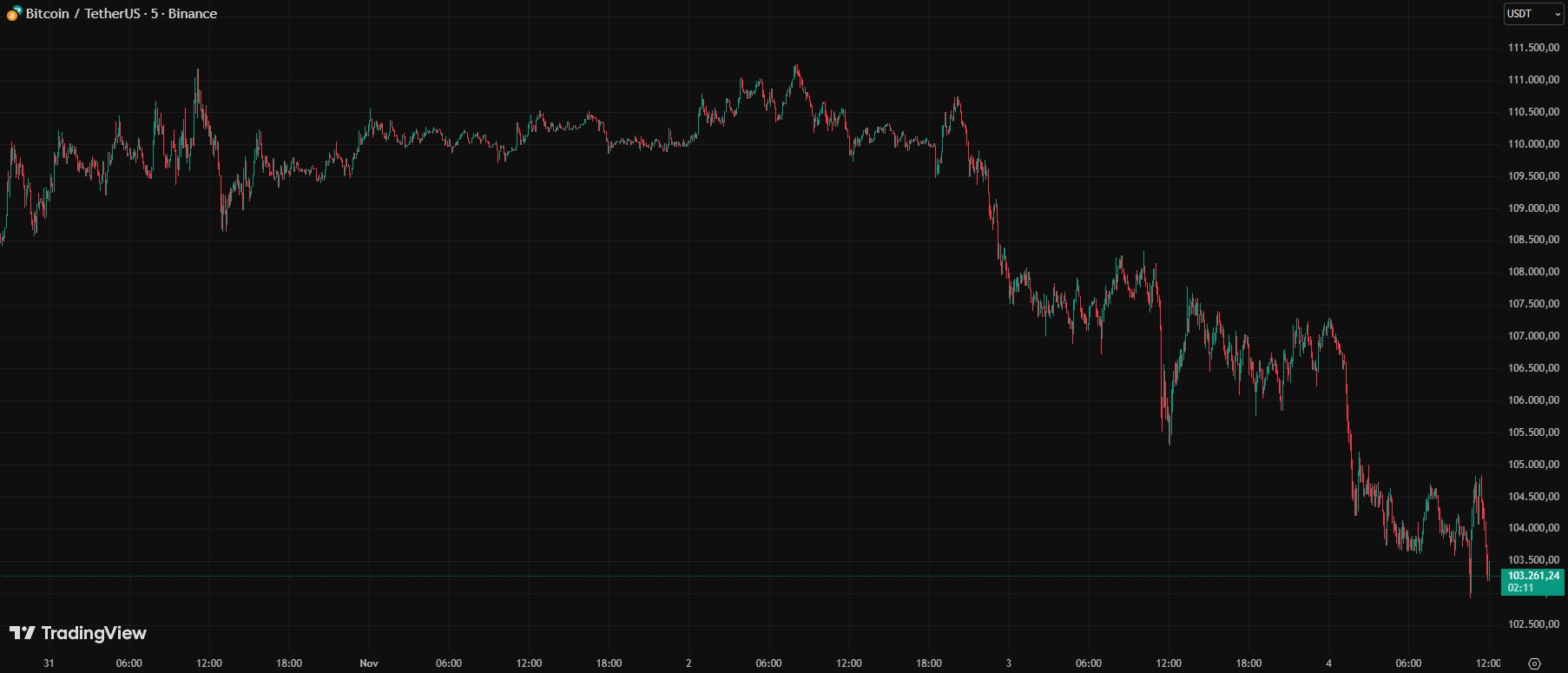 En general, Merino piensa que el actual momento del mercado no debe interpretarse como un cambio de tendencia, sino como una fase natural de consolidación en medio de un ciclo de crecimiento más amplio. Ello, aun cuando BTC ha caído más de 4% en apenas cinco días, como se ve continuación: