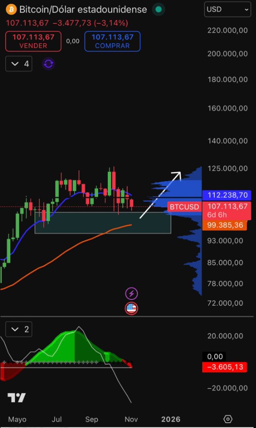El analista destaca esa área como punto de acumulación estratégica, proyectando un rebote hacia USD 112.000–125.000, mientras la tendencia general continúa siendo alcista y controlada. Más allá, considera que puede haber un nuevo tramo alcista entre los USD 125.000 y los USD 147.000.