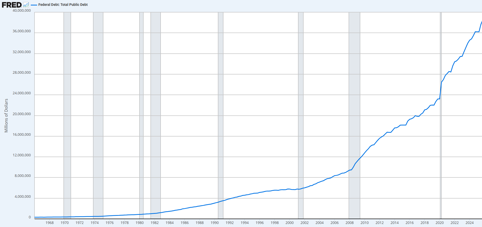 El siguiente gráfico, muestra la deuda federal de Estados Unidos, año por año. Actualmente se encuentra en 38,51 billones de dólares, nivel al que se ha llegado para financiar guerras y paliar varias crisis económicas, entre otras razones que dan como resultado lo que ahora podría ser un problema estructural (aunque Powell lo minimiza):