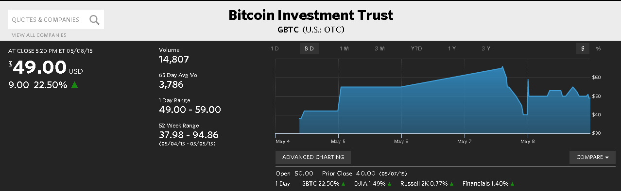 Las acciones que cotizan en la bolsa de la Bitcoin Investment Trust (BIT) utilizando el ticker GBTC, el primer vehículo que cotiza en bolsa atada a Bitcoin, comenzaron la jornada del pasado 4 de mayo con un buen interés inicial del usuario. El precio de la acción inicial fue planeado para ser una décima parte del precio de venta de un Bitcoin menos las comisiones, pero ya estamos viendo el precio por acción elevarse por encima de ese nivel.