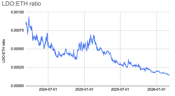 El gráfico incluido en la propuesta permite visualizar con claridad esta divergencia. En él se observa cómo la relación entre el precio de LDO y ETH ha caído de forma sostenida en los últimos dos años. La curva muestra un descenso pronunciado hasta niveles actuales cercanos a 0,00016, muy por debajo de los rangos en los que se movía históricamente, que rondaban entre 0,0004 y 0,0005.