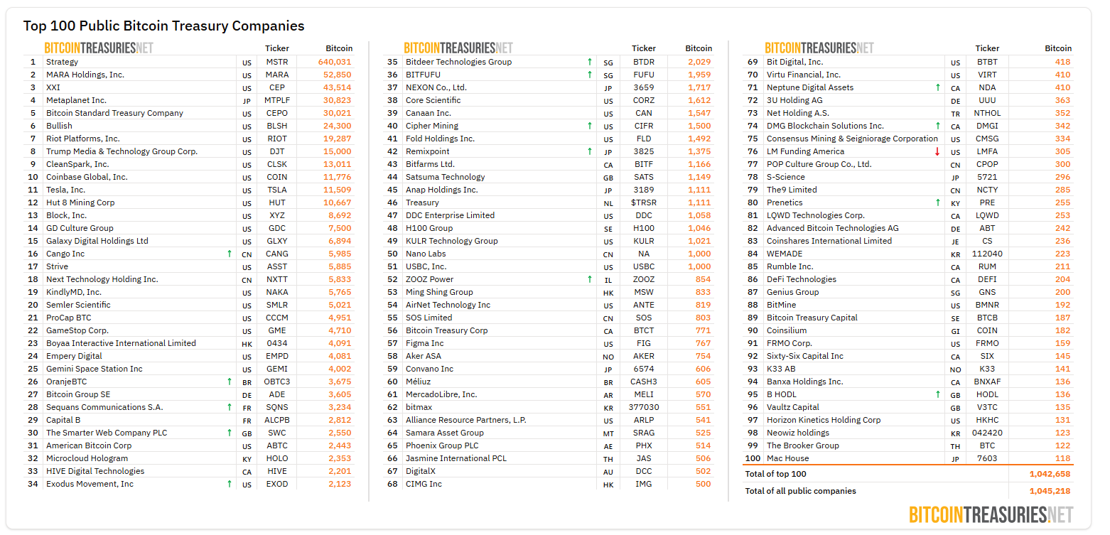 En la siguiente tabla, provista por el portal BitcoinTreasuries, se observan las 100 compañías de cotización pública con más cantidad de BTC en su poder: