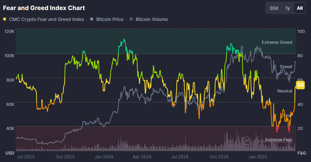 En el รกmbito de bitcoin y las criptomonedas, el รndice de Miedo y Avaricia de CoinMarketCap marca 53, un nivel neutral. Este indicador, que oscila entre 0 (miedo extremo) y 100 (avaricia extrema), mide el pulso emocional del mercado.