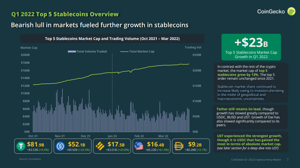 En contraste con el resto del mercado de criptomonedas, la capitalización de las stablecoins ha subido en alrededor de un 13% durante el primer trimestre de este año. Al menos, eso refiere un reporte trimestral de CoinGecko con respecto a las principales 5 stablecoins (monedas con valor anclado al dólar) del mercado.