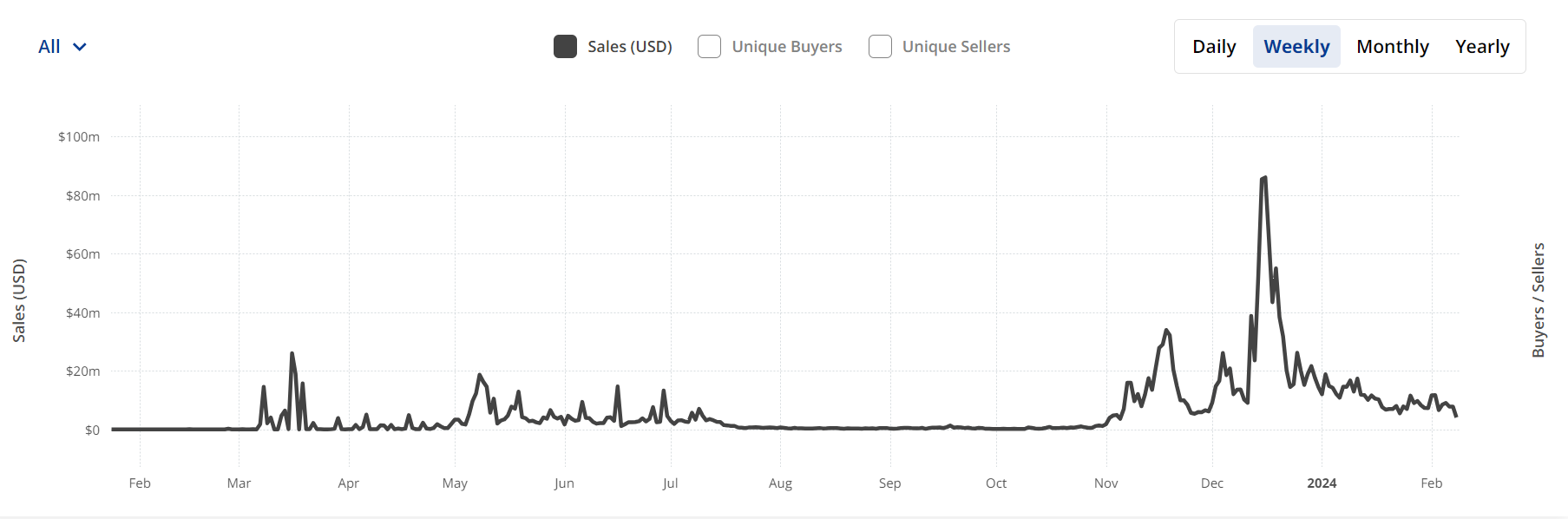 En cambio, diciembre de 2023 había sido un mes de alta actividad en el comercio de tokens de Ordinals. Así lo demuestra el volumen de USD 868 millones registrado durante ese mes, con un fuerte pico de transacciones a mediados de diciembre.
