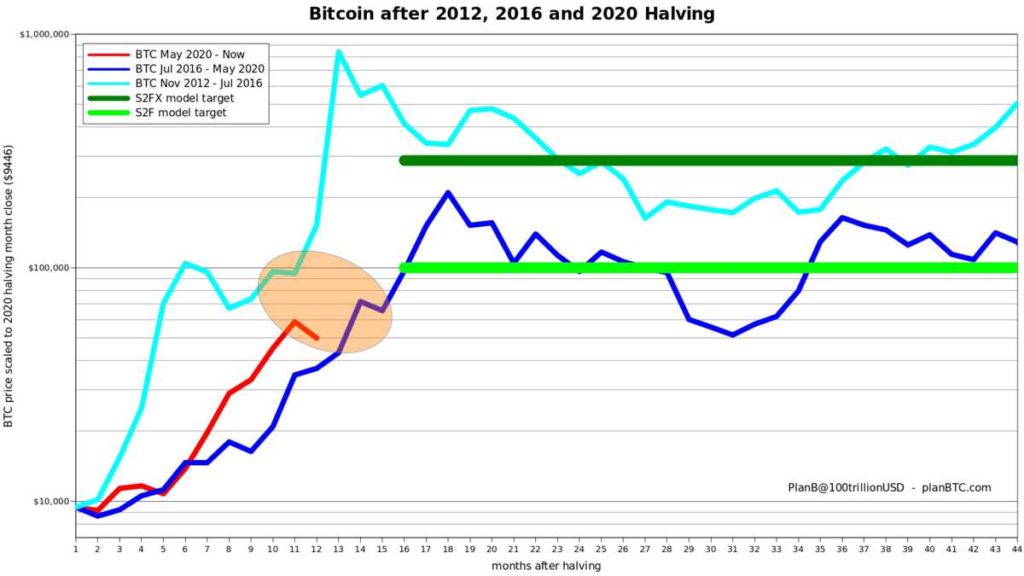 Respecto a la corrección actual del precio de bitcoin, este tuit de PlanB (@100trillonUSD) compara la evolución del ciclo actual de bitcoin (línea roja) con los ciclos de 2013 (azul claro) y 2017 (azul oscuro).