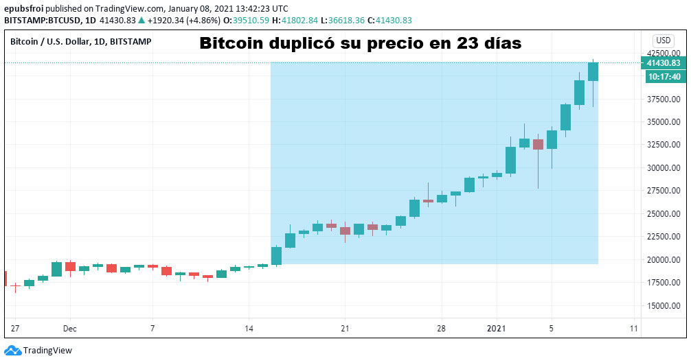 Los avances de bitcoin en los últimos siete días han acelerado su apreciación en el mercado, después de concluir uno de sus mejores años. En claro contraste con el repunte de 2017, bitcoin se muestra saludable en este ciclo alcista pues se ha mantenido el empuje institucional que se reveló como uno de los factores claves para su auge en 2020. Bitcoin logró duplicar su valor en 23 días, con lo cual alcanzó más del 100% por encima de su tope histórico de 2017.