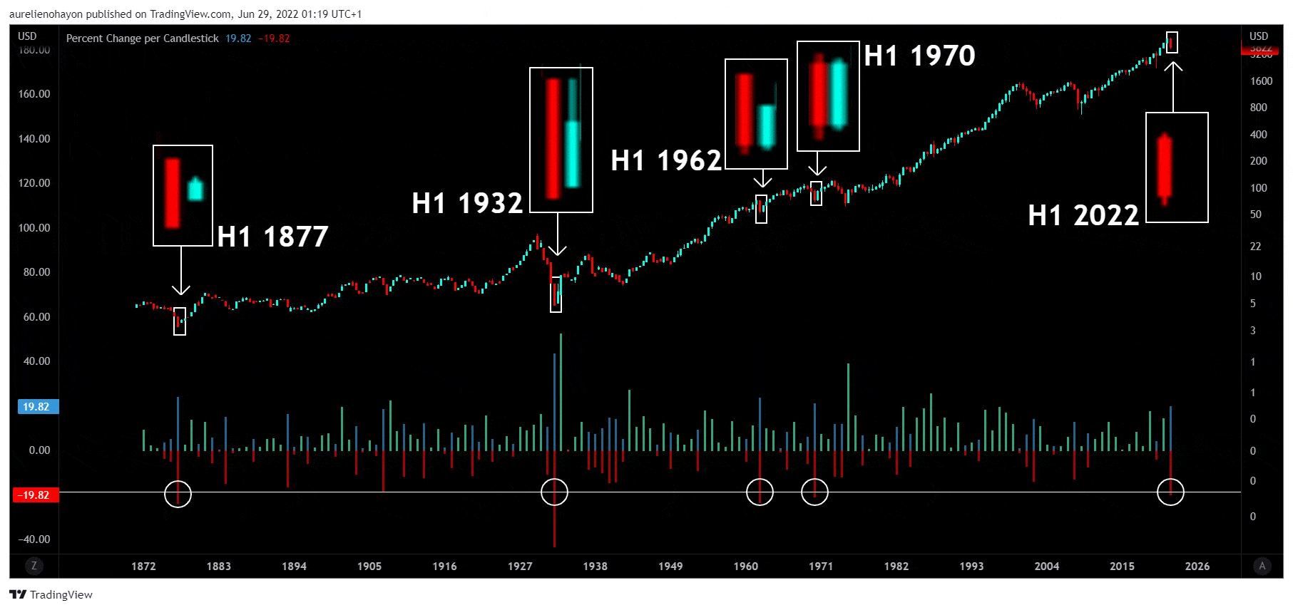 En este gráfico se muestran los cinco peores semestres de desempeño del índice S&P 500 en siglo y medio de historia de dicho índice, incluyendo el semestre que acaba de concluir. Ahora bien, en el primer semestre de los años 1877, 1932 (la Gran Depresión), 1962, y 1970, la caída de S&P 500 fue del 20% o superior, pero en esas cuatro oportunidades hubo un repunte del mismo.