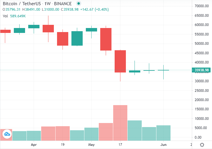 En esta ocasión, bitcoin tocó los USD 31.681 el martes 8 de junio, con una depreciación de casi 10% en 24 horas, comenzando la semana en rojo. Sin embargo, el miércoles volvió a subir 12% y, desde entonces, se ha mantenido en el rango de semanas anteriores, entre los 34.000 y 37.000 dólares por unidad, según datos de TradingView.