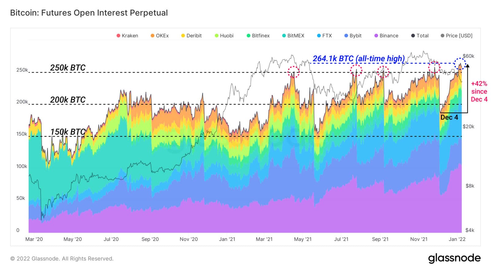 En medio del decrecimiento del precio de BTC en las últimas semanas, el mercado de futuros ha resurgido con fuerza. El interés abierto de los futuros perpetuos de bitcoin, que corresponden a los contratos continuos abiertos, registró un máximo histórico de 264.000 BTC en la semana del 3 al 9 de enero.