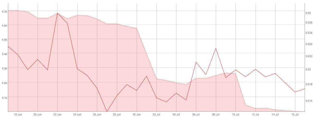 Más de seis semanas de baja volatilidad parecen presagiar una ruptura en la evolución del precio de bitcoin en un futuro cercano. De las fluctuaciones de precio que comentábamos desde inicios de mayo, entre 9.000 y 10.000 dólares, la curva de cotización de BTC parece seguir una oscilación amortiguada: no hay movimientos bruscos ni hacia al alza ni hacia la baja.