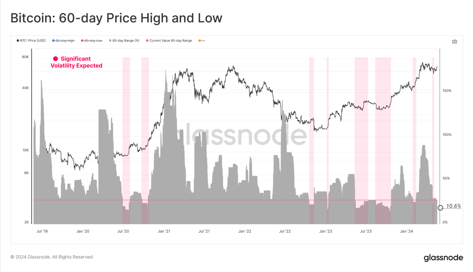 La firma de análisis menciona también que, desde el precio máximo histórico que marcó bitcoin, la volatilidad de precio se ha comprimido significativamente. Una muestra de ello es la siguiente métrica que mide el rango porcentual entre los precios más altos y más bajos de los últimos 60 días.