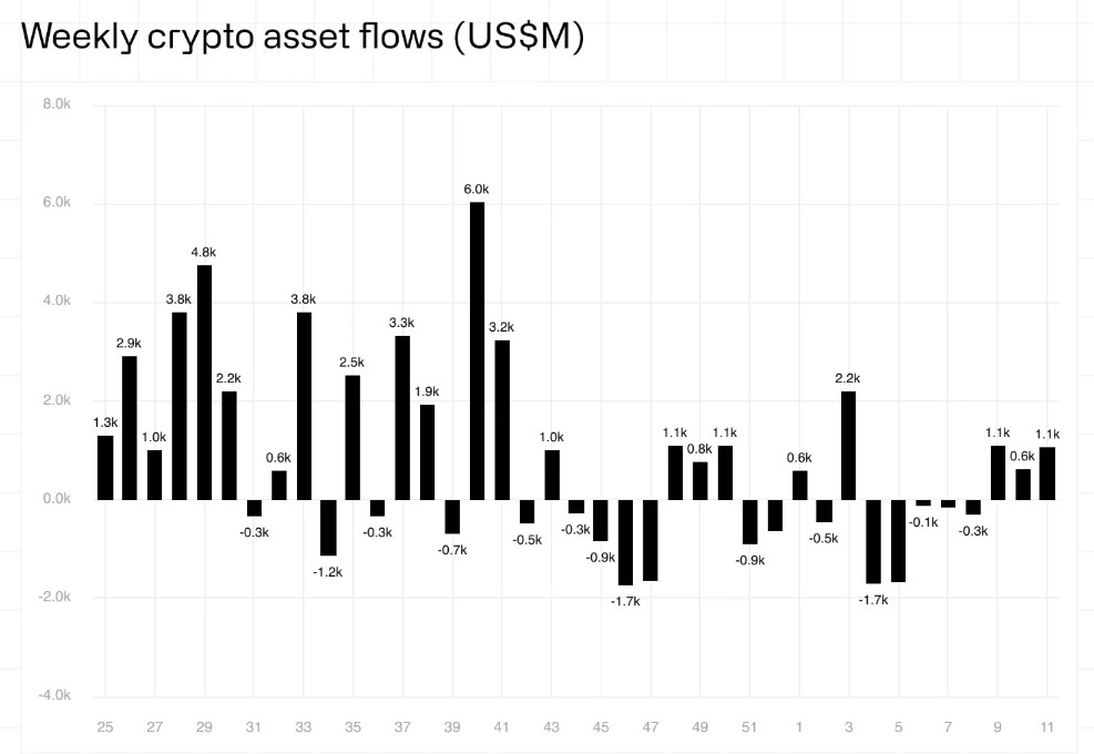 Los productos de inversión en activos digitales a nivel mundial registraron entradas de 1.060 millones de dólares la semana pasada, lo que supone la tercera semana consecutiva de ingresos de capital.