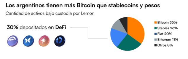 ยฟCรณmo se ve esto en Argentina? Para leer el fenรณmeno conviene separar tenencia de uso. Segรบn datos de Lemon (un exchange de bitcoin y criptomonedas), la composiciรณn de cartera de los usuarios locales muestra mรกs bitcoin (33%) que stablecoins (26%) y que pesos.