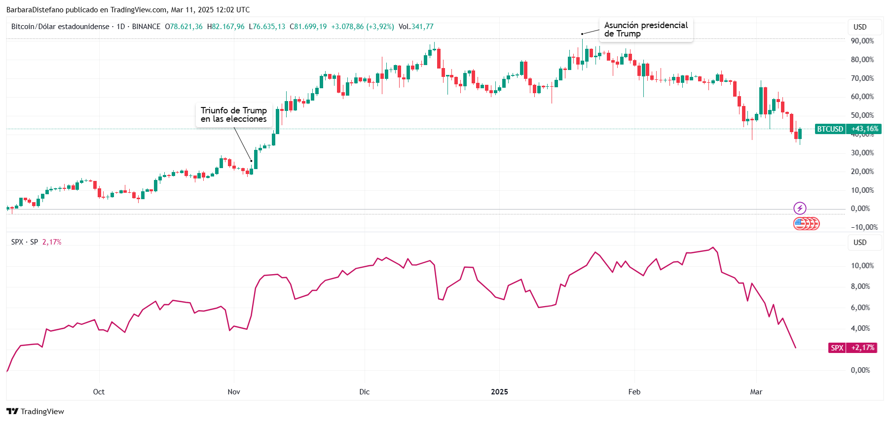 Esto sucede pese a que las acciones estadounidenses marcaron nuevos precios máximos históricos hace casi un mes y bitcoin hace casi dos cuando Trump asumió como presidente, tal como puede verse a continuación.