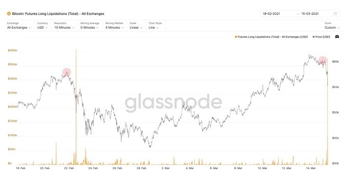 Para ilustrar la situación publicó una gráfica que refleja la liquidación de futuros en largo, es decir, los comerciantes que apuestan al aumento del precio de Bitcoin.