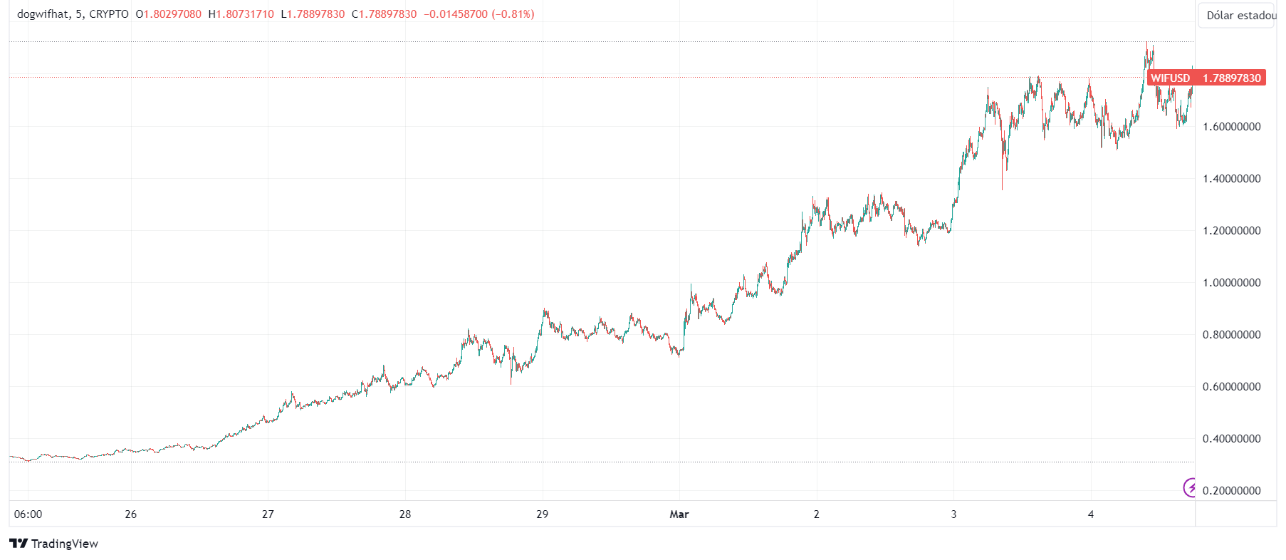 El precio mรกs alto de dogwifhat (WIF) fue de USD 1,90.