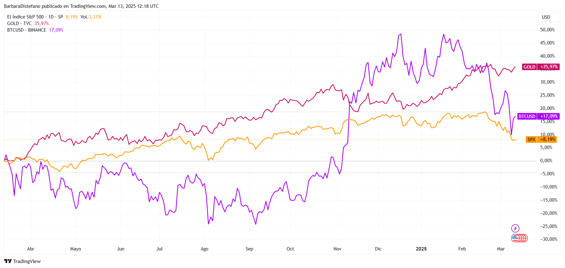 “Esto supone una disrupción para las acciones, las materias primas, los bonos y las criptomonedas”, exclama. En otras palabras, mientras siga la incertidumbre económica, el oro podría continuar viéndose beneficiado, a diferencia del mercado bursátil estadounidense y los activos digitales como bitcoin.
