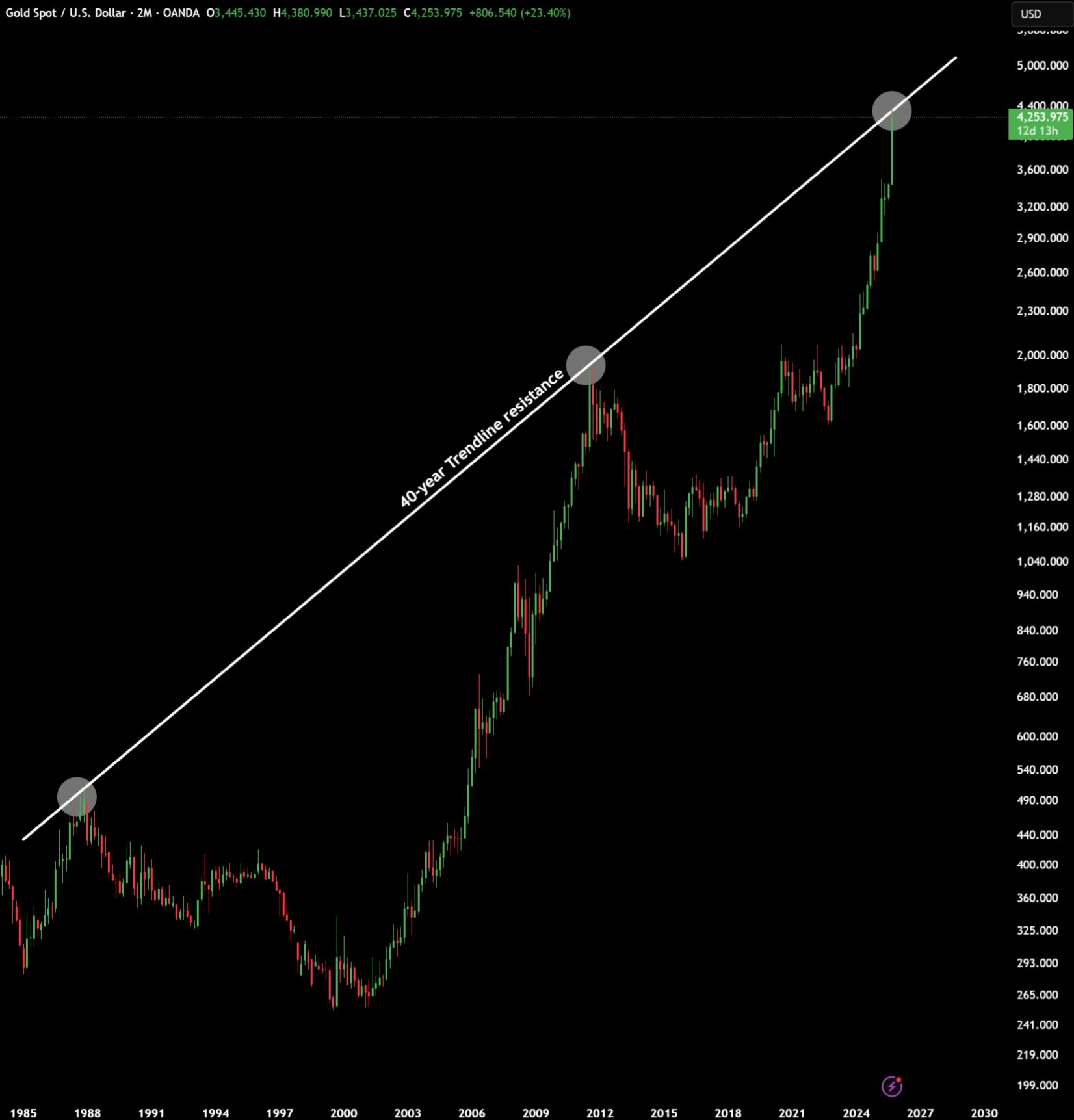 Es que el oro ha tocado una línea de tendencia que ha funcionado como resistencia durante los últimos 40 años, iniciada en 1985.