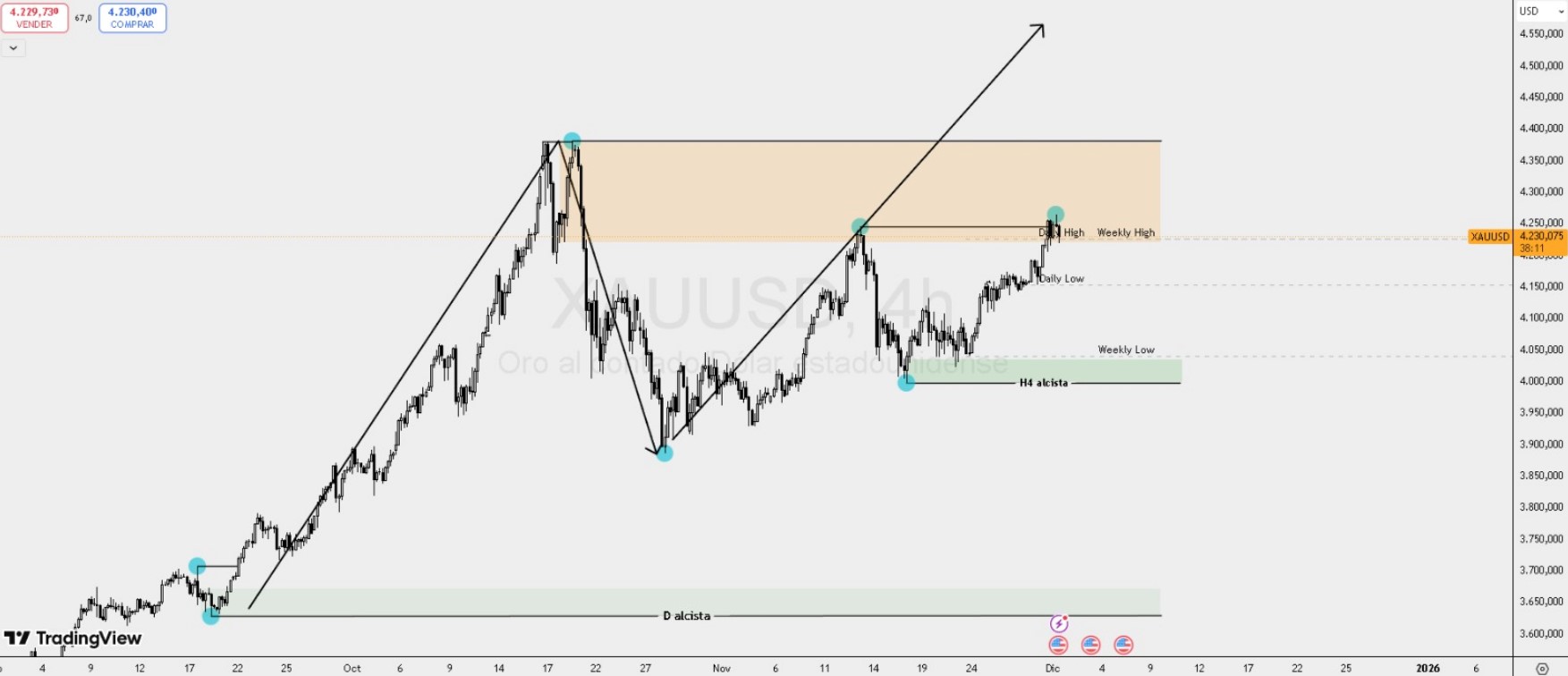 El gráfico provisto por el analista Juárez refuerza esta lectura. En su análisis, el oro probablemente está dentro de un nuevo impulso diario y semanal que lo llevaría a la superación del último máximo histórico en los 4.381 dólares.