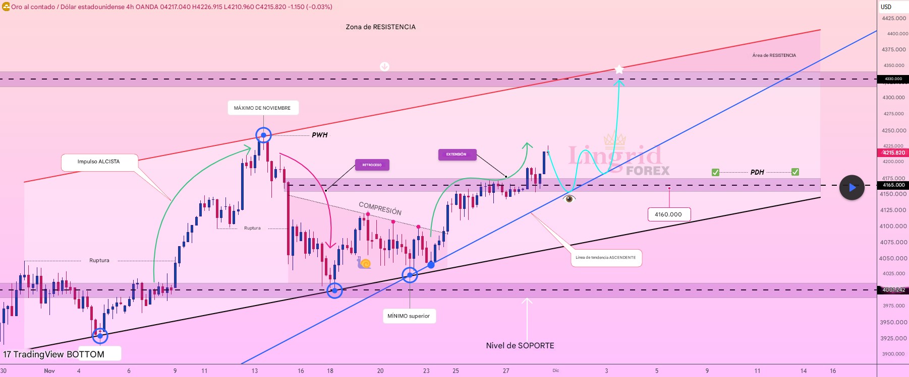 De acuerdo con este escenario, se sugiere la continuación de tendencia, lo cual proyecta un objetivo técnico en torno a los 4.330 dólares. Sin embargo, no se descarta un posible retroceso previo.
