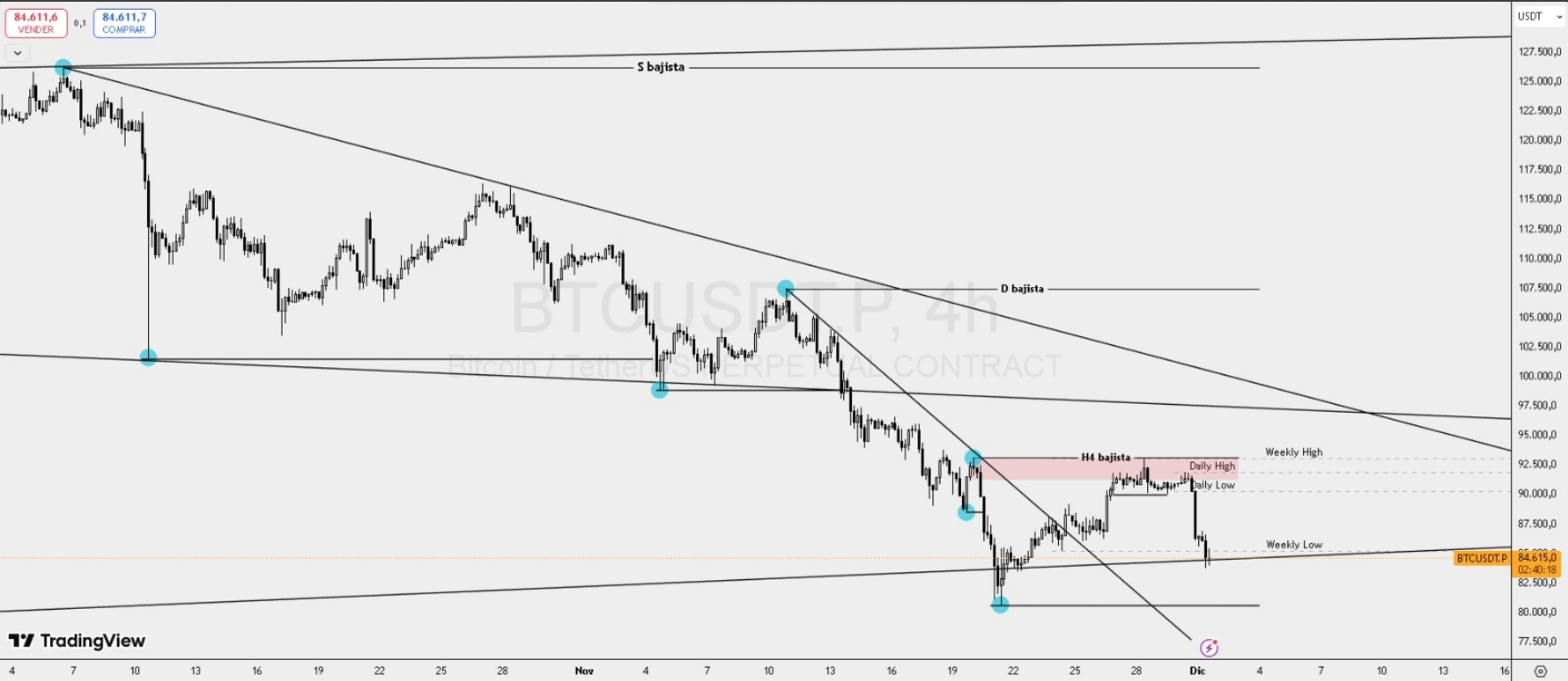 Los gráficos proporcionados por Juárez muestran a BTC atrapado en una estructura bajista de mediano plazo, con máximos descendentes en marcos diarios y de 4 horas.