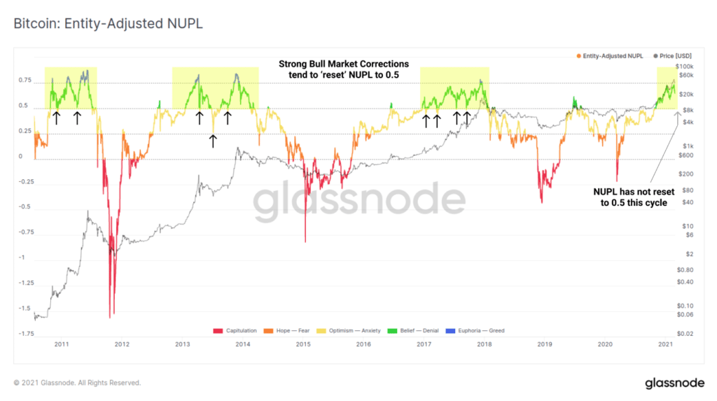 Glassnode hace hincapié en cómo este comportamiento dista mucho de mercados alcistas anteriores. Específicamente, lo contrasta con los ciclos de 2013 y 2017. Y de hecho, si se llegara a resetear el NUPL como lo ha hecho antes, el precio de bitcoin tendría que llegar a USD 21.766, indican los investigadores. Por el momento, las correcciones no se han siquiera acercado a ese precio.