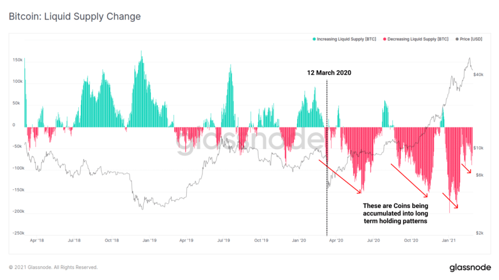 Otra métrica destacada en el informe de Glassnode es la creciente acumulación de bitcoins. Y básicamente desde el 12 de marzo de 2020, la liquidez de bitcoins en el mercado se ha ido reduciendo de forma sostenida.