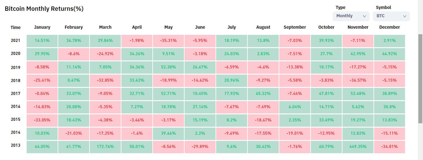 En el cuadro siguiente se muestran los retornos mensuales de bitcoin desde 2013. Contrasta el gran empuje de los tres primeros meses del aรฑo, con las caรญdas sucesivas de abril a junio. El tercer trimestre representa un regreso del crecimiento del precio despuรฉs de la correcciรณn de abril a junio, que llegรณ al 55%.