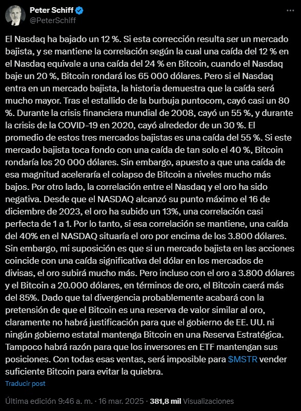 Así, el propietario de Euro Pacific Capital advierte que si el índice Nasdaq, compuesto principalmente por empresas tecnológicas y de alto crecimiento, entra en un mercado bajista, la caída podría ser aún más severa. Para respaldar su postura, cita tres crisis pasadas en las que el índice perdió entre un 30% y un 80%, con una caída promedio del 55%: la burbuja puntocom (2000-2002), el colapso financiero de 2008 y el desplome del COVID en 2020. En caso de que el Nasdaq baje un 40%, Schiff estima que bitcoin podría caer hasta los USD 20.000, aunque advierte que una caída tan fuerte podría generar pánico y desencadenar un colapso aún mayor en el precio, llevándolo a niveles mucho más bajos.