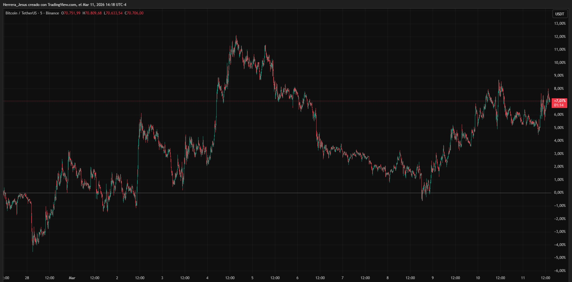 En medio del panorama bélico y su impacto sobre el negocio petrolero global, bitcoin está actuando solo y poniendo a prueba su madurez como activo digital. Desde el inicio del conflicto, la moneda ha subido un 7% y se mantiene estable sobre los USD 70.000, tal como se ve en la siguiente gráfica: