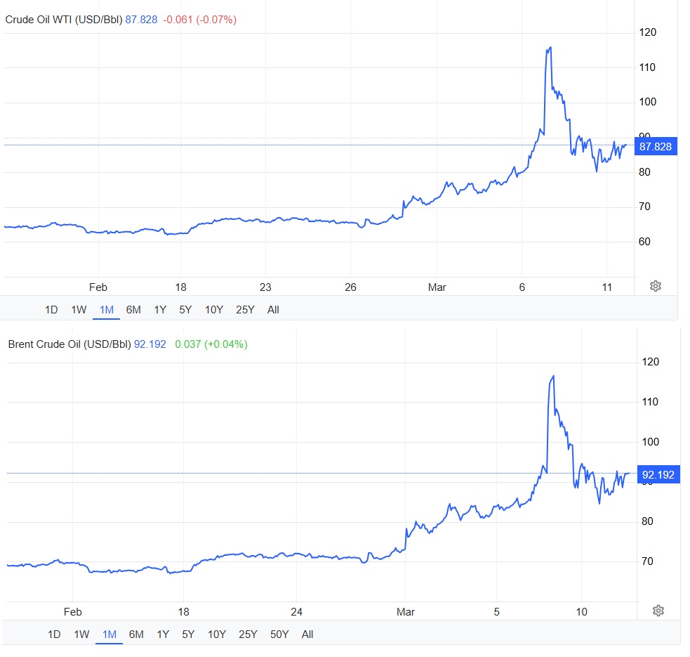 El impacto del conflicto en Irán se mide directo en el mercado petrolero. Tal como se aprecia en las gráficas a continuación, los precios del crudo Brent y WTI han subido de forma explosiva desde el pasado 28 de febrero, cuando iniciaron los primeros ataques que resultaron en la neutralización del líder supremo de Irán, Alí Jameneí.