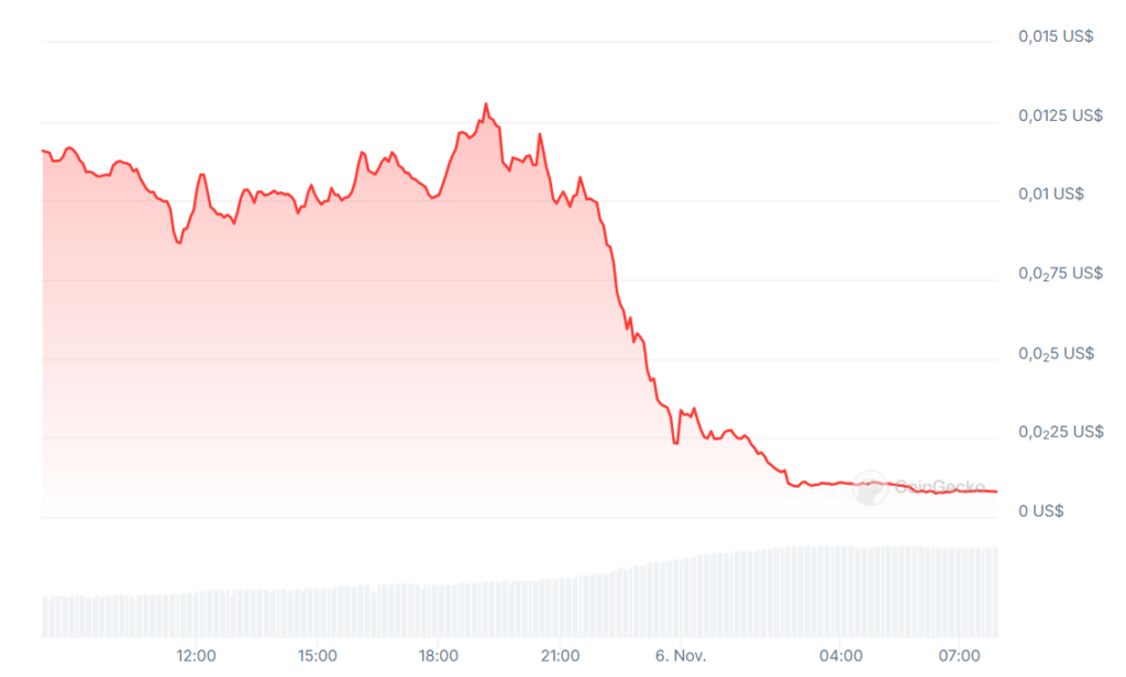 La memecoin Kamala Horris (KAMA), que llegó a cotizar en 0,013 dólares el día de las elecciones, hoy tiene un valor de apenas 0,0008 dólares, lo que representa una caída estrepitosa del 93%, como se puede apreciar en el siguiente gráfico.