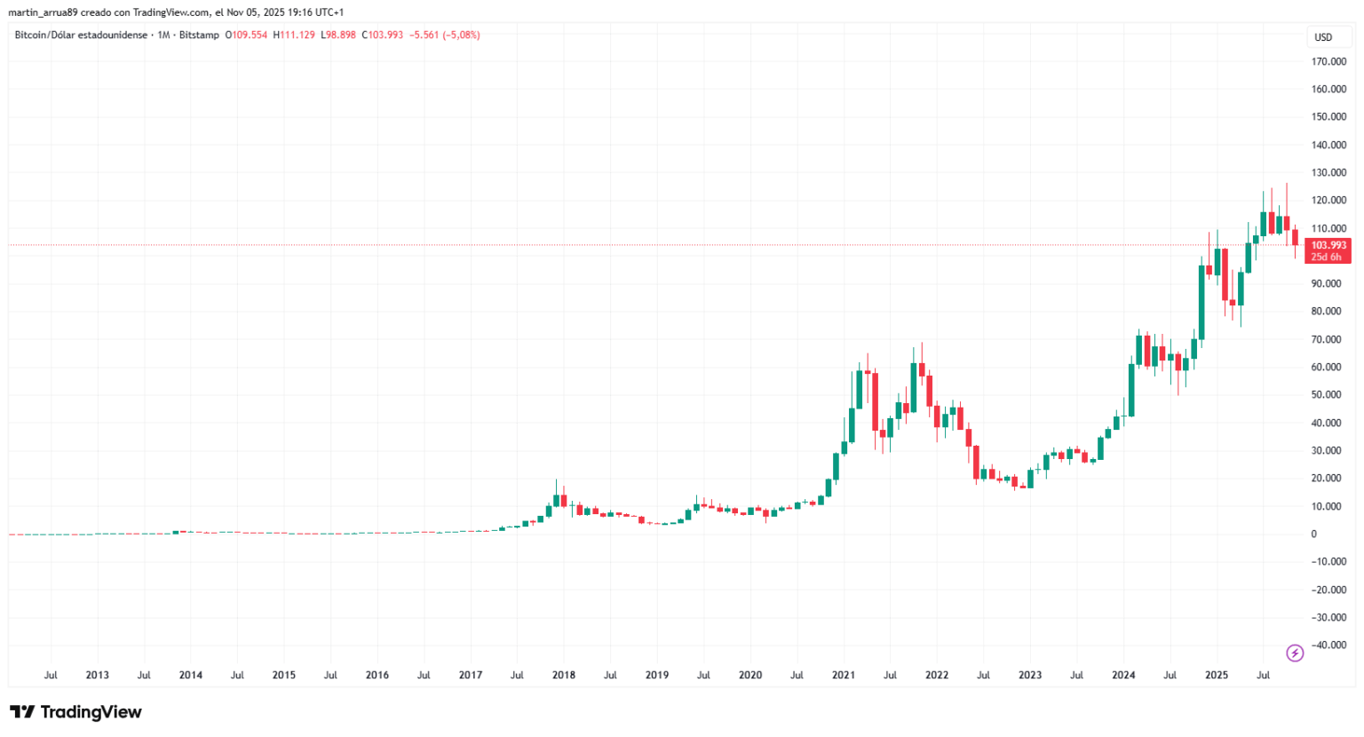 Otra cuestión que hay que destacar es que BTC tiende a apreciarse con el tiempo, tal como se observa en el siguiente gráfico: