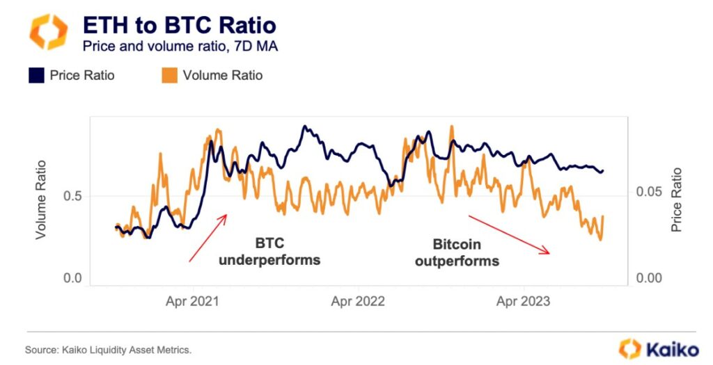 De hecho, ETH ha tenido un rendimiento muy inferior al del mercado en general desde el Merge, una de las actualizaciones de su red ocurrida en septiembre del año pasado. Tanto el precio como su relación de volumen de trading frente a BTC han tendido a la baja desde finales de 2022, según el siguiente gráfico de la firma de análisis, Kaiko.