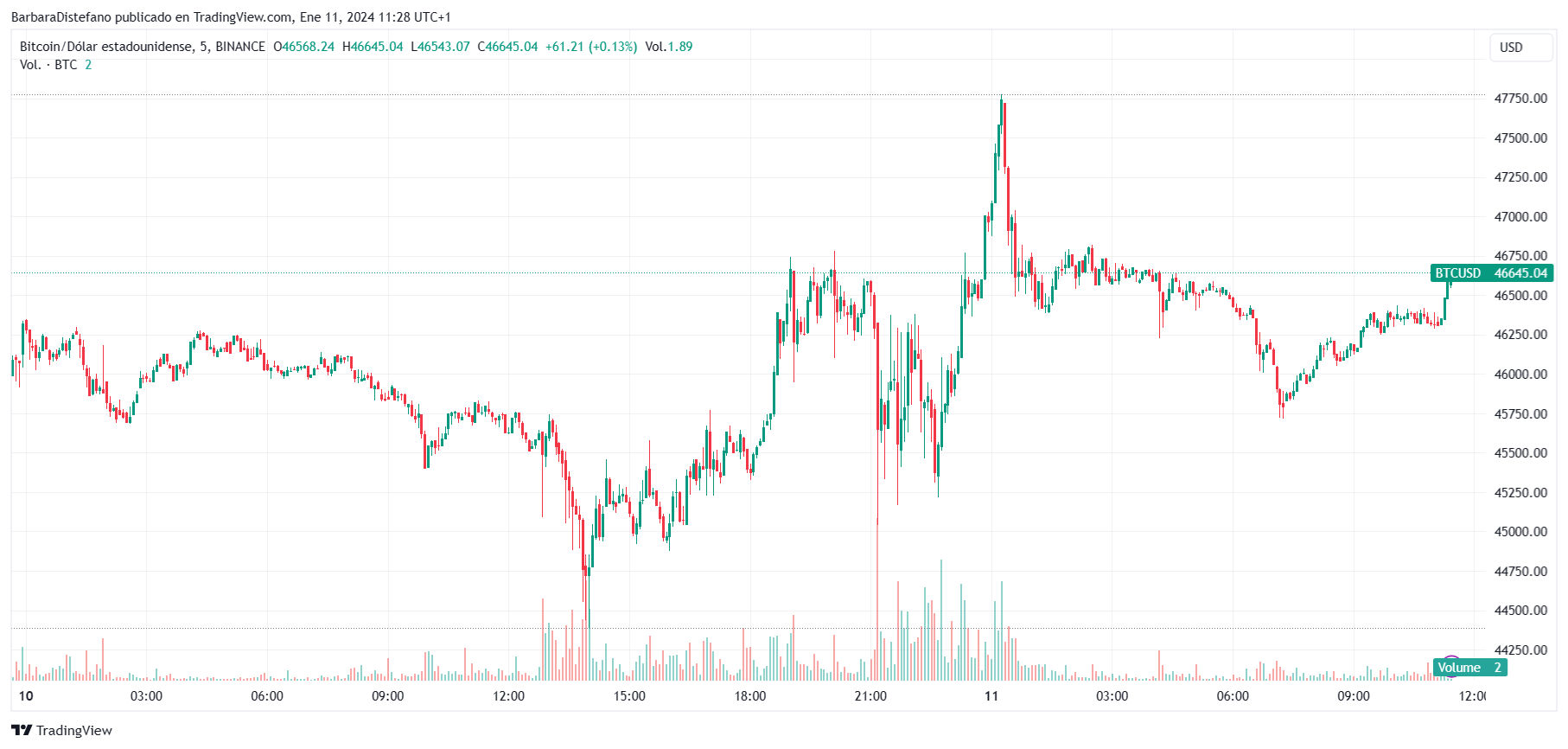 Aunque bitcoin (BTC) experimentó una ligera alza hasta los USD 47.000 tras la aprobación de sus fondos cotizados (ETF) spot en Estados Unidos, retrocedió luego. Precisamente regresó a la zona en la que estaba lateralizando entre los USD 45.000 y los USD 46.000.