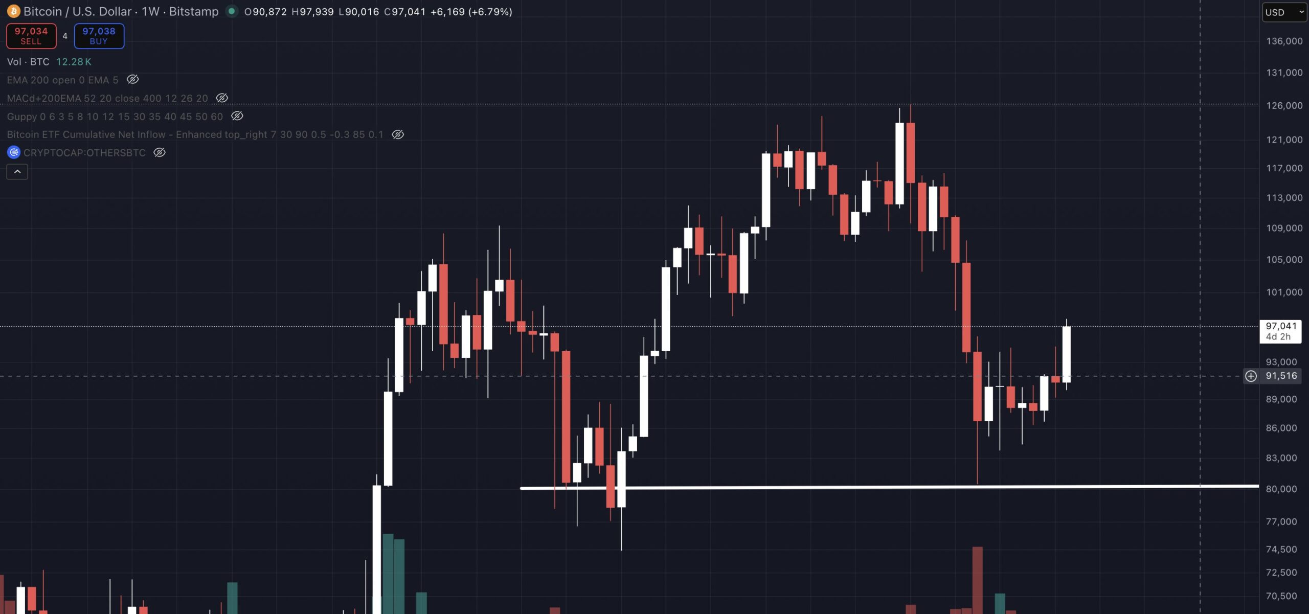 Como se observa en el gráfico, a pesar de la caída, bitcoin ha mantenido 9 mínimos semanales consecutivos estableciendo un nivel clave de soporte (línea blanca) en los 81.000 dólares.