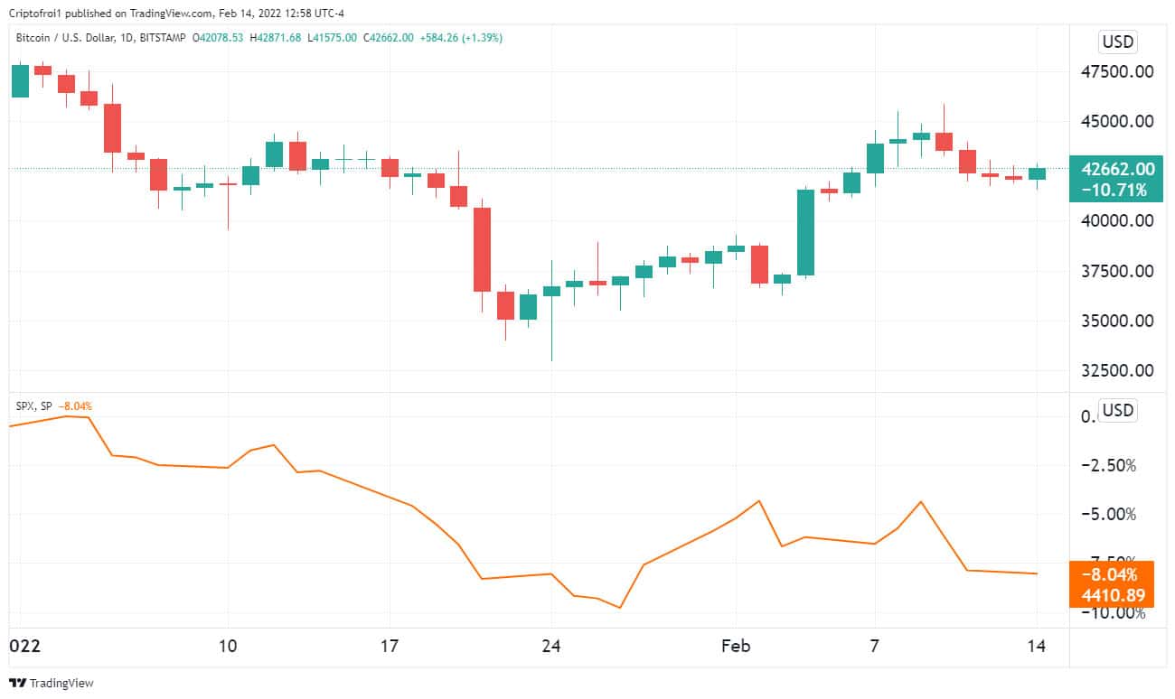 Como lo destacó CriptoNoticias a mediados de enero pasado, se aprecia un estrecho acoplamiento del precio de bitcoin con los activos tradicionales, como se constata en la curva inferior del índice S&P 500.