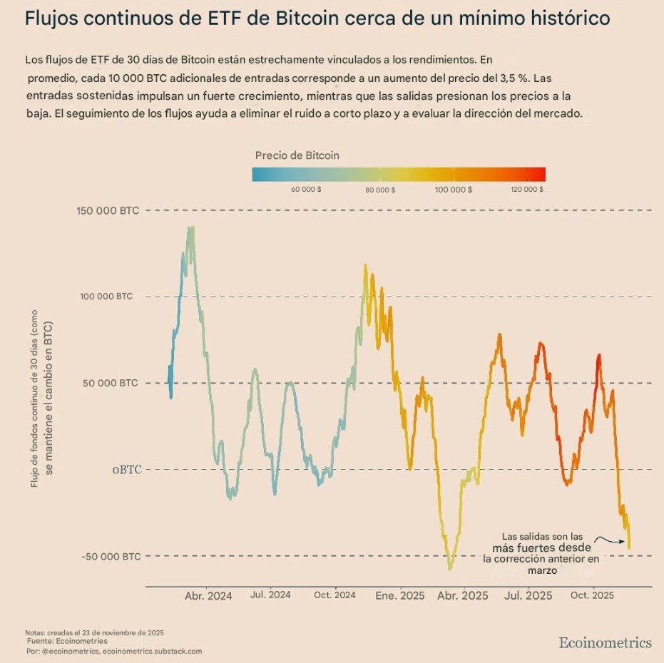 Por ahora, la señal decisiva sigue siendo la misma: los flujos de los ETF. El mercado no tendrá bases sólidas hasta que las redenciones se frenen y la curva de 30 días muestre un giro claro, según Ecoinometrics.