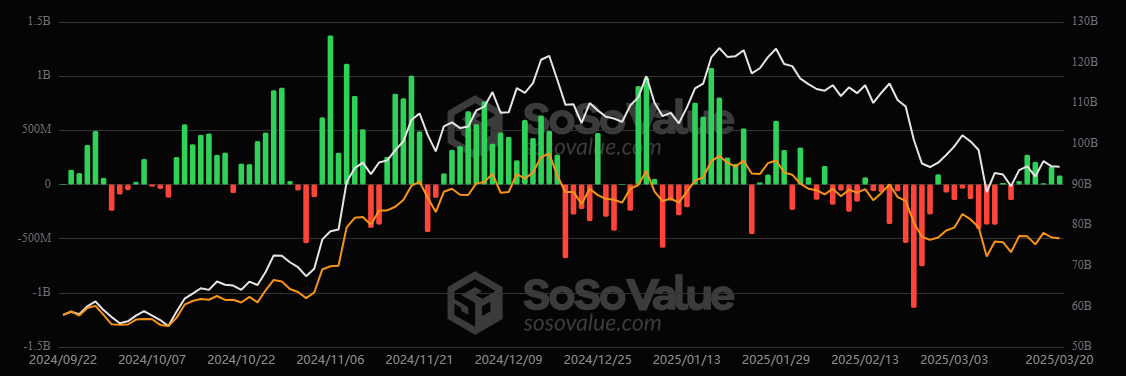 De acuerdo con SoSoValue, los ETF de BTC presentaron entradas netas positivas desde el 13 de marzo hasta el viernes 20, luego de haber sufrido grandes salidas a finales de febrero y comienzos de marzo.